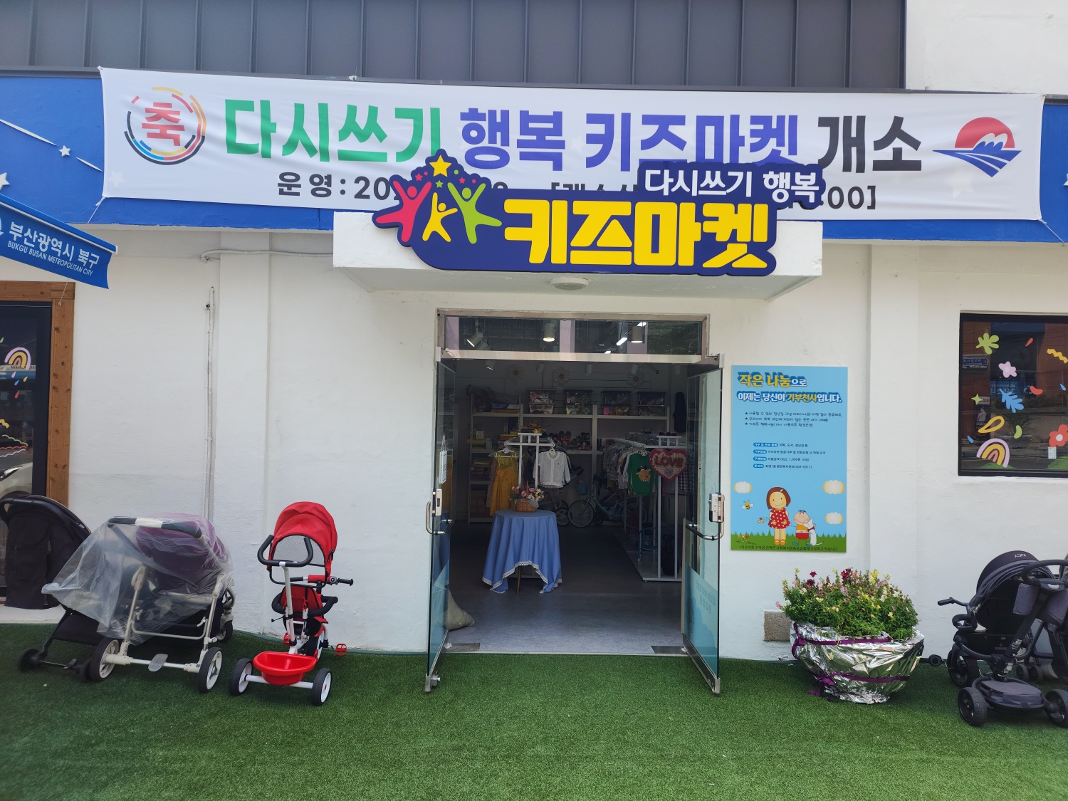 화명 지하철 2번 출구에서 도보 3분 거리에 있는 ‘다시쓰기 행복 키즈마켓’에는 유아용품 판매점과 유아도서관 등이 운영되고 있다.